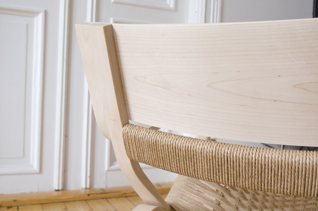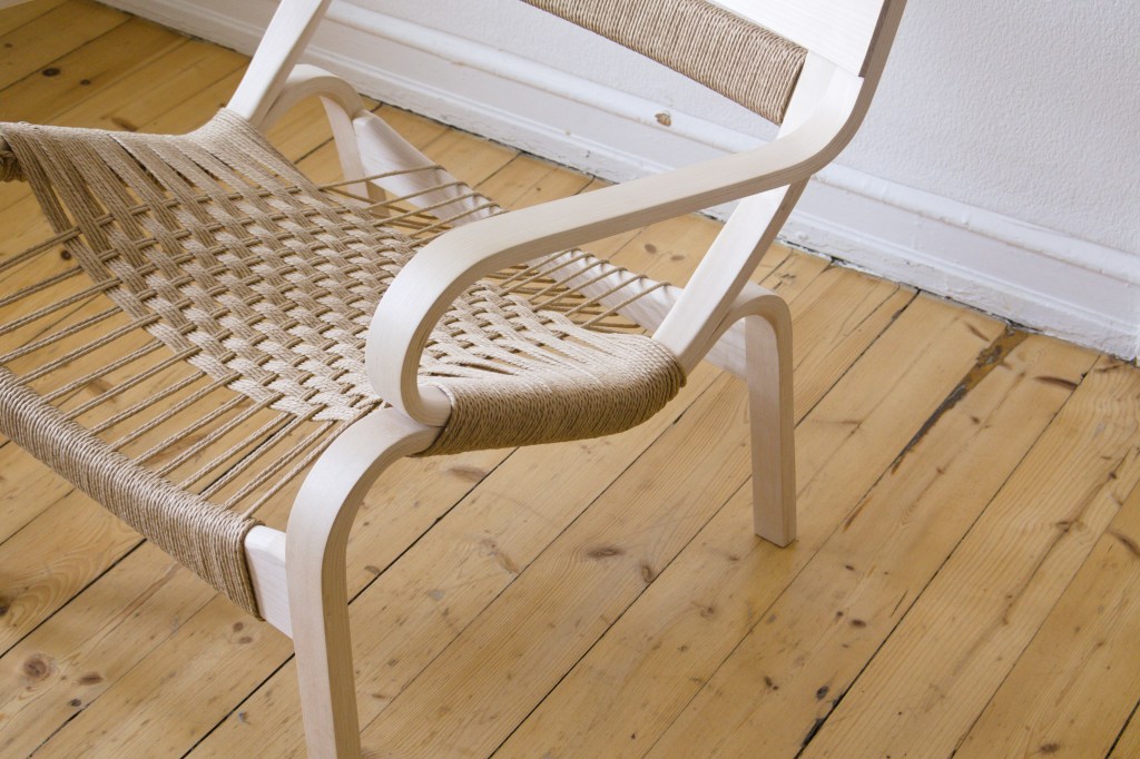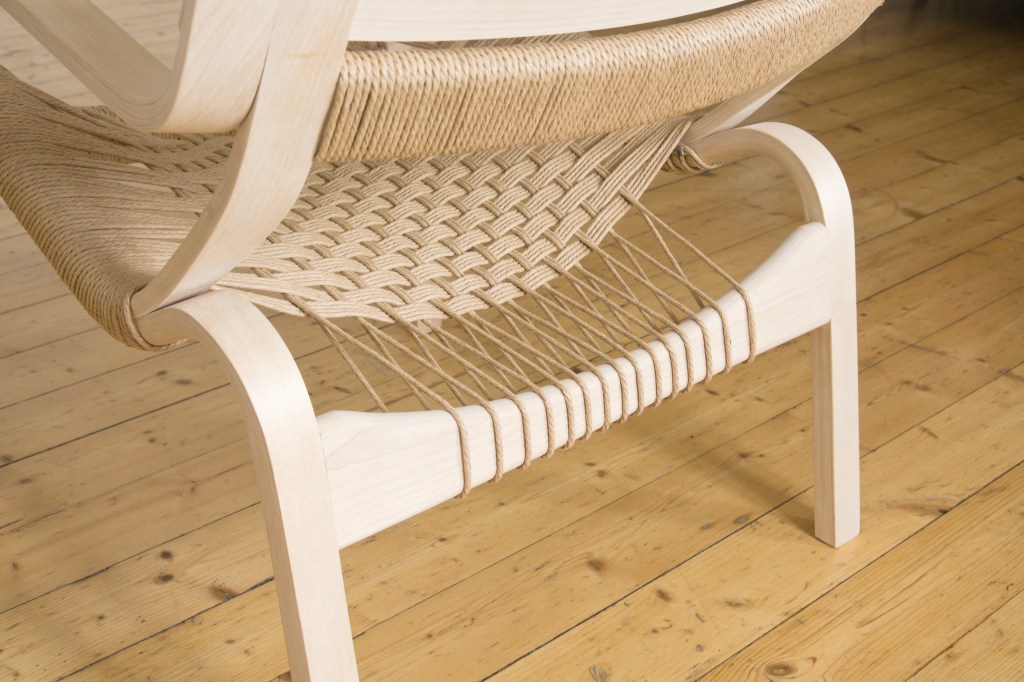 Tangent is a lightweight lounge chair, in laminated birch wood and woven paper cord.