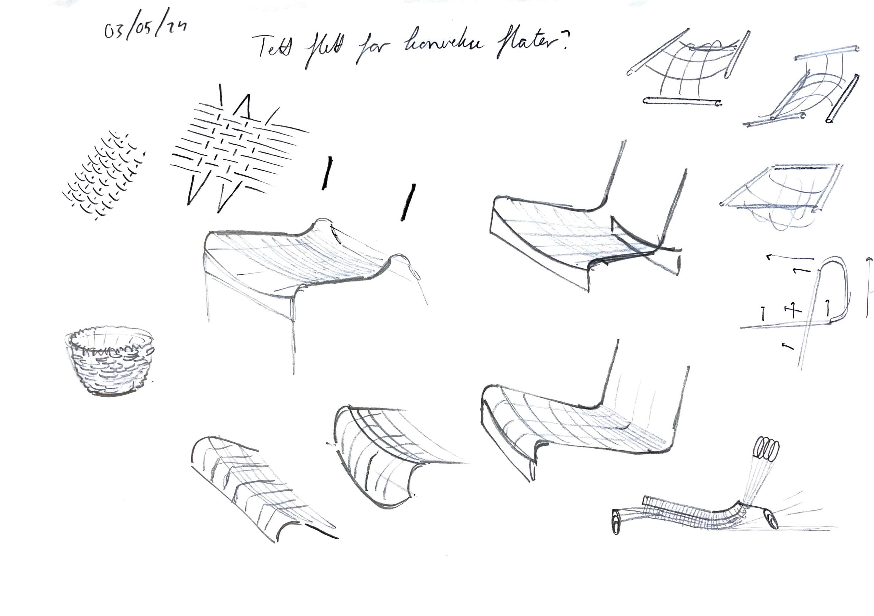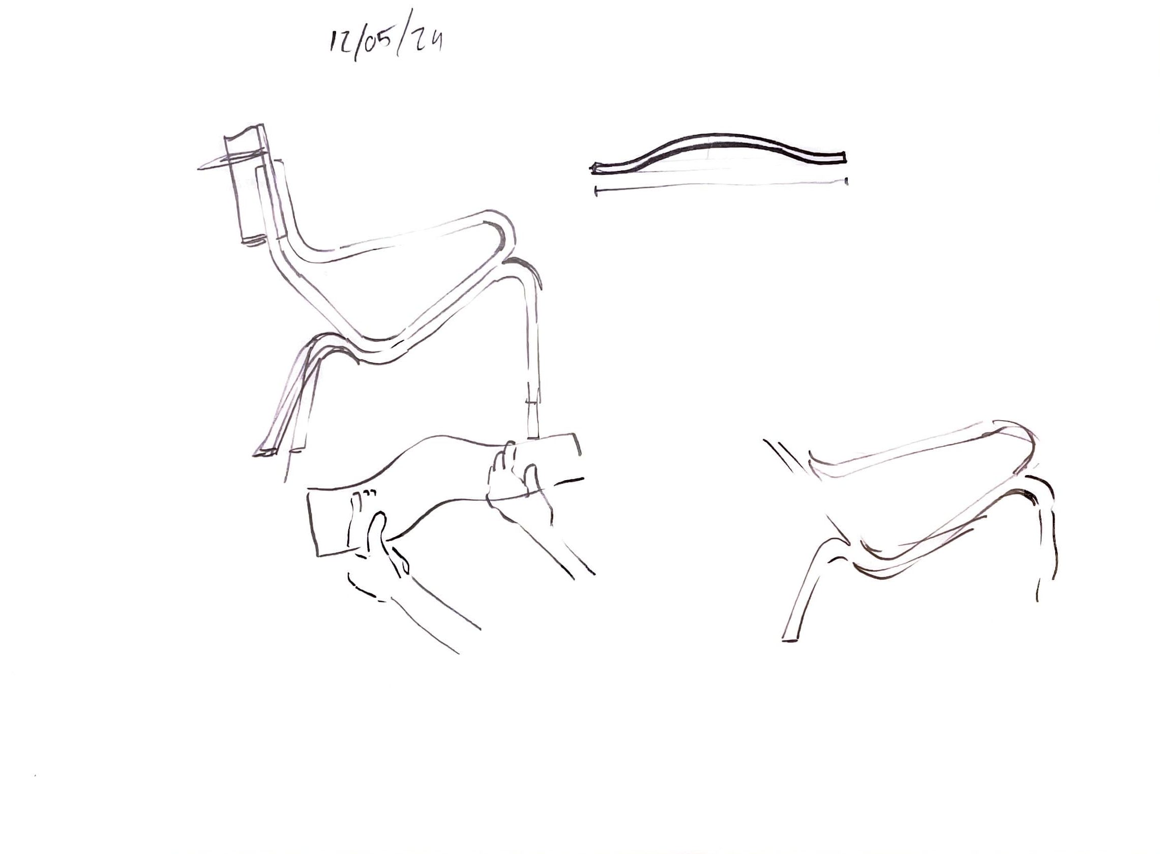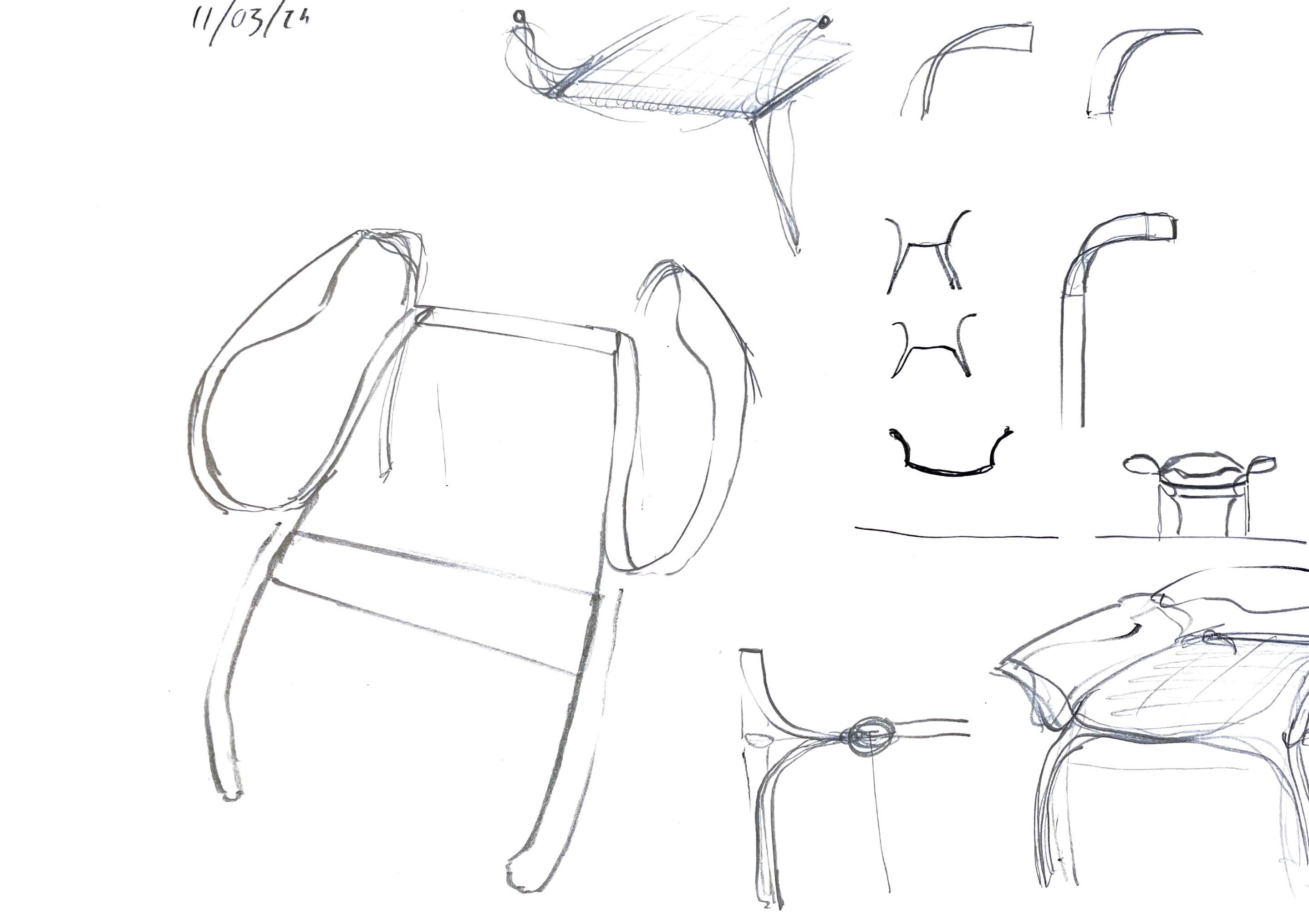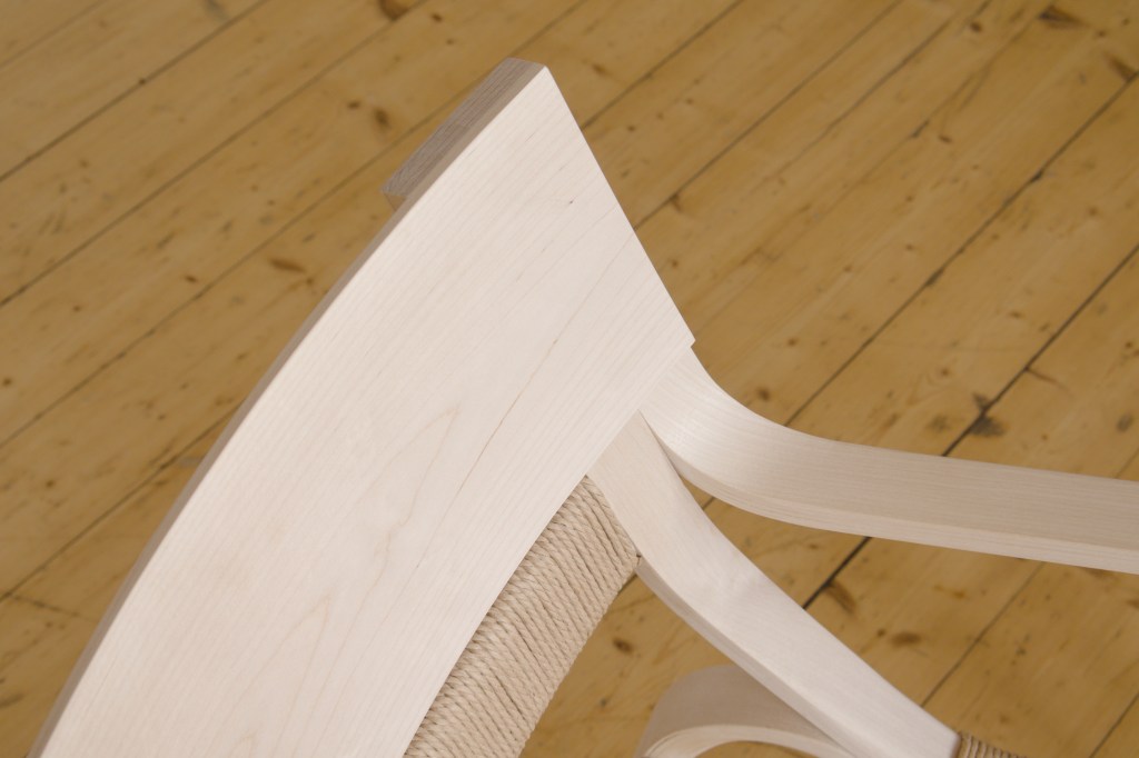 The design is characterized by a low and laid back seating position, and an open, minimalistic construction. The armrests are thin laminated profiles, but because of their ergonomic position and rounded geometry they provide comfortable contact surfaces. The backrest, a simple sheet of wood with a generous curvature, creates a welcoming space. The wood is untreated, to maintain the direct expression of the material. 2025.
